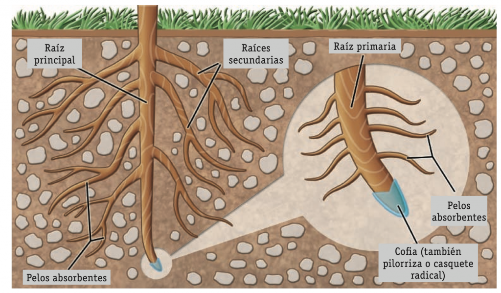 Del suelo las plantas no solo extraen agua también extraen las sales minerales que están disueltas en dicha agua, estos nutrientes son absorbidos por los pelos absorbentes que mayormente se encuentran en la zona pilífera de la raíz (Figura 1.1).